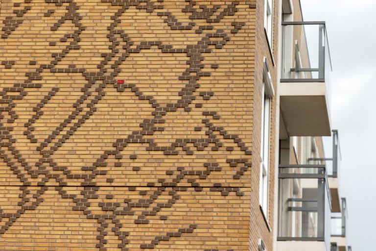 Het polderlandschap van het oude Diemen wordt op abstracte wijze verbeeld in het metselwerk van Ravelijn.