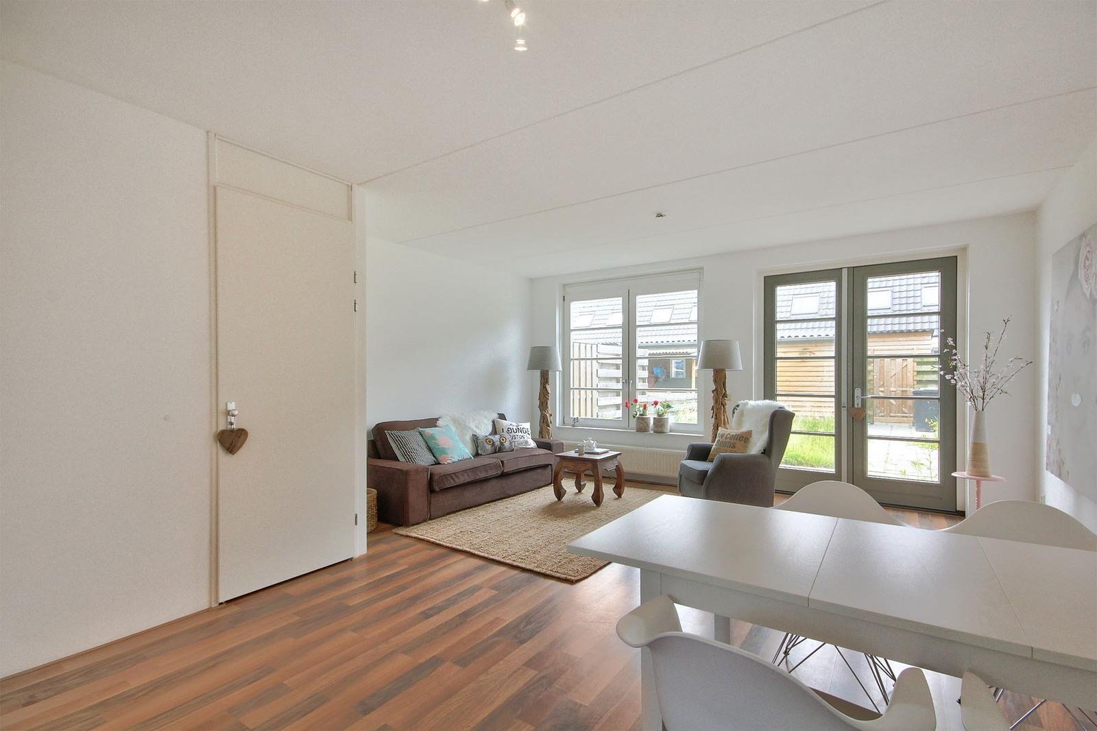 Voor de tussenwoning geldt dat je vanuit de hal de woonkamer bereikt. Aan de woonkamer grenst de half open keuken welke is voorzien van een koel-/vries combinatie, combimagnetron, gaskookplaat, vaatwasser en rvs afzuigkap. Vanuit de woonkamer heb je uitzicht op de tuin.
