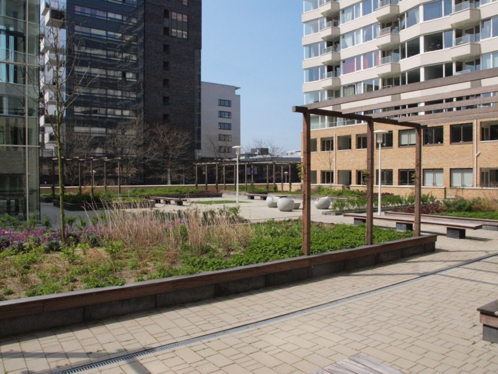 The residential complex offers a diversity of flats, all equipped with a luxury kitchen with high-quality built-in appliances and a spacious bathroom with bath, shower and/or double washbasin. In the hall is a separate toilet and a storage room for the washer / dryer, there is also a (bicycle) storage in the underground parking garage. In addition, the complex has a beautiful courtyard garden.