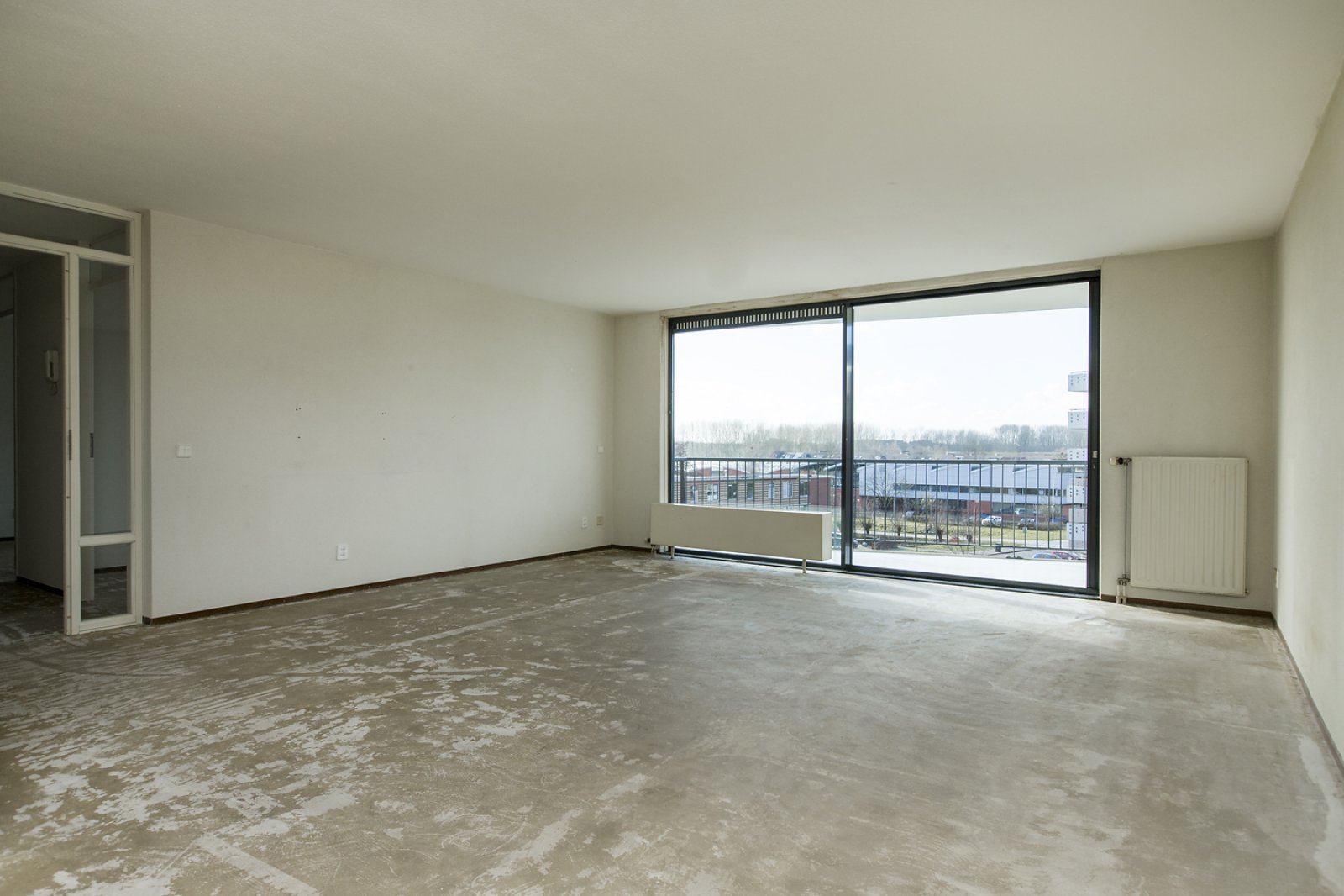 Aan de linkerzijde treft u de keuken, evenals de bijkeuken. In de bijkeuken zit de aansluiting van de wasmachine gesitueerd. De ruime woonkamer is gelegen aan het einde van de gang. Vanwege de grote raampartijen is de woonkamer zeer licht. De woonkamer biedt u toegang tot het balkon welke gelegen is op het zuiden.