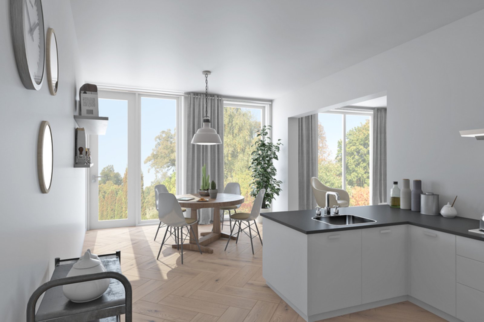 De ruime woonkamer heeft veel natuurlijke lichtinval en sluit mooi aan op de open keuken, voorzien van moderne afwerkingen en alle noodzakelijke inbouwapparatuur. De tuin biedt een fijne plek om buiten te ontspannen, met voldoende ruimte voor een zit- of speelhoek.